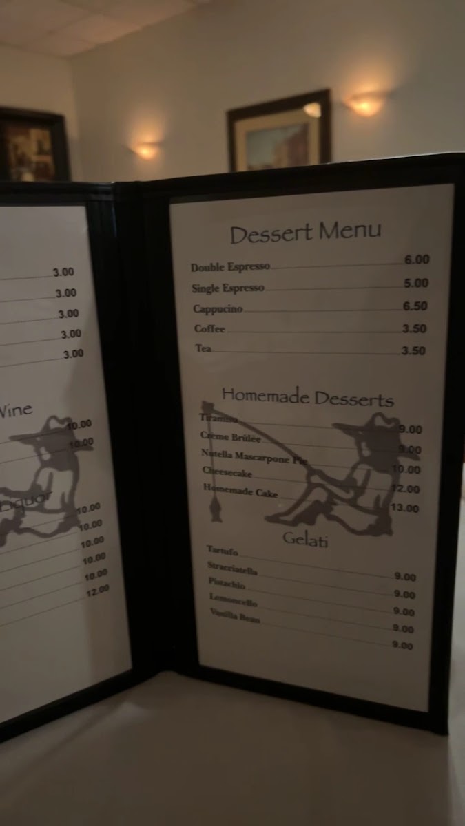 Guests will find flavorful options ranging from hot starters like Calamari Fra Diavolo, served in a spicy tomato sauce, to hearty pasta selections such as Penne Amatriciana and Rigatoni Alla Siciliano. Soups like Minestrone alla Milanese and Brodo di Pollo provide a warm, soothing beginning to any meal. For something sweet, house-baked desserts including Pistachio Creme Filled Vanilla Cake offer a satisfying finish without being overly sweet.